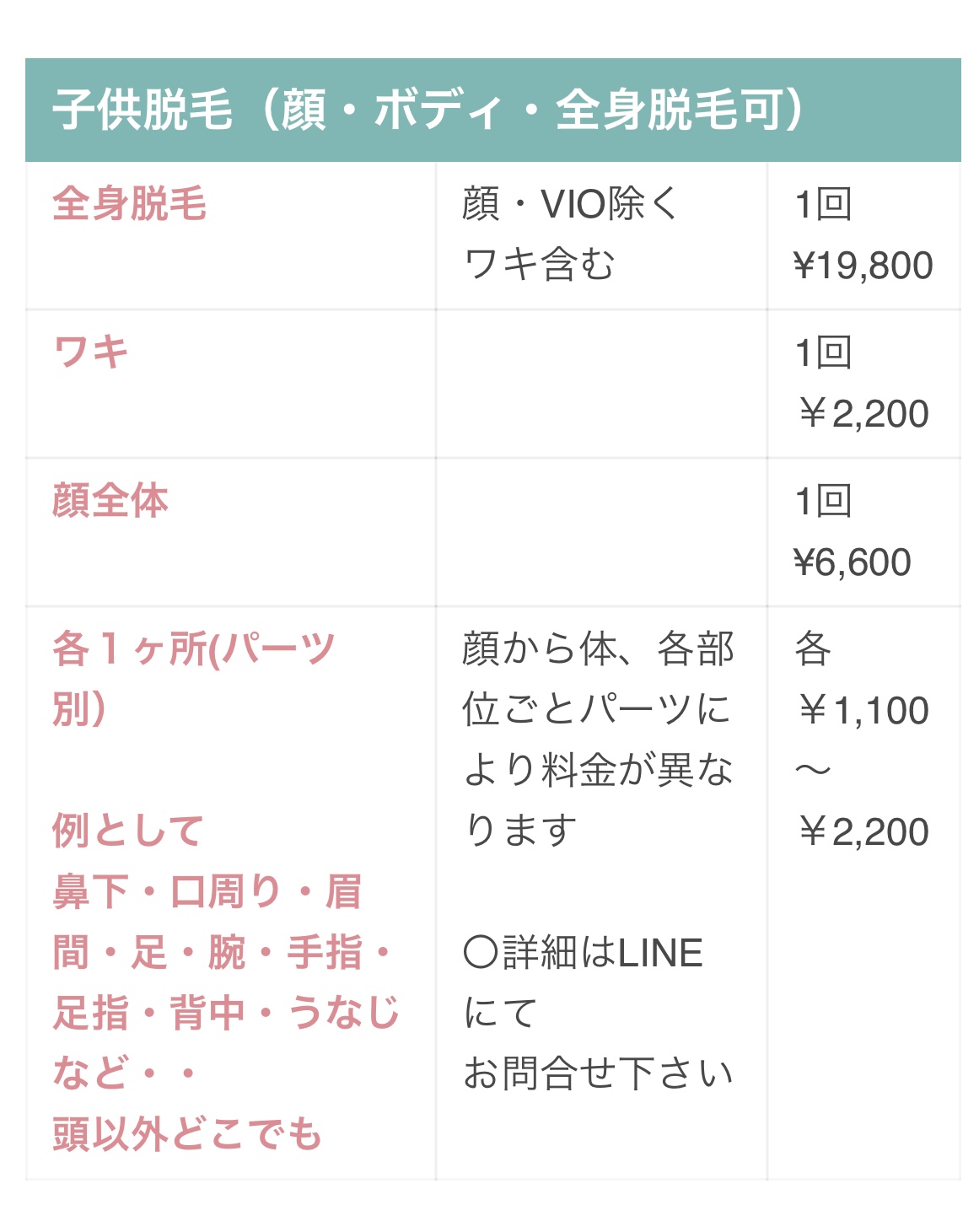 ※当サロンの脱毛器は幼児から使用可能ですが安全性を考慮し、小学生以上のお子様を対象に施術させて頂きます (安全性の意味とは、施術中に目を閉じていられるか、光を当てている時にじっとしてられるかです。)